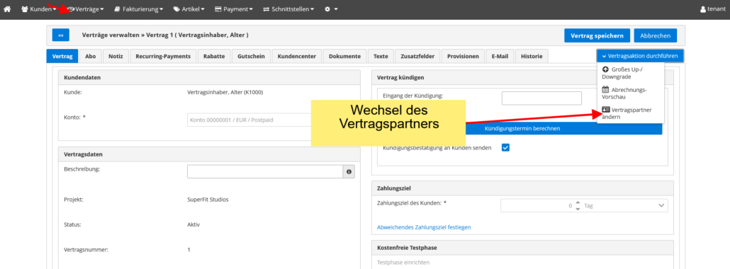 - Mit der Änderung werden automatisch alle Verträge des betroffenen Kontos auf den neuen Kunden umgeschrieben