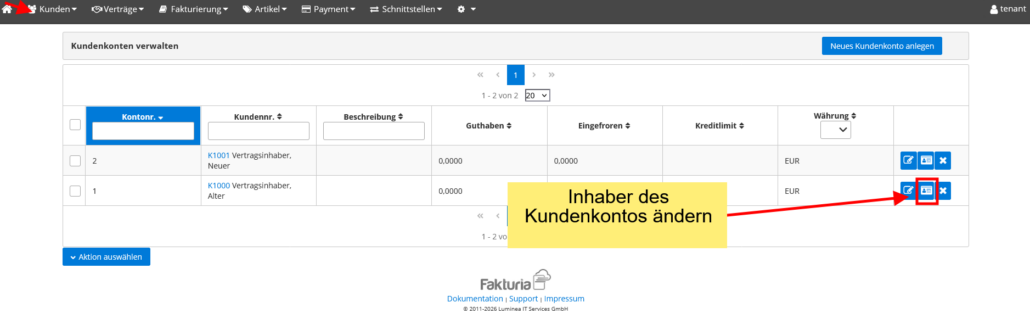 Der Besitzer des Kundenkontos lässt sich in der Übersichtsmaske der Kundenkonten umstellen: