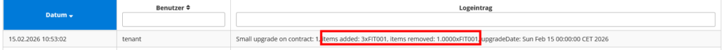 Auch beim Upgrade/Downgrade am Vertrag wird ein Protokolleintrag erzeugt. Beim kleinen Upgrade/Downgrade wurde dabei bis dato nur die Anzahl der geänderten Aboartikel vermerkt, also z.B. entfernte Artikel 2 x, neu hinzugebucht 1 x. Dies führte regelmäßig bei Analysefällen zu Irritationen bzw. war zu ungenau.